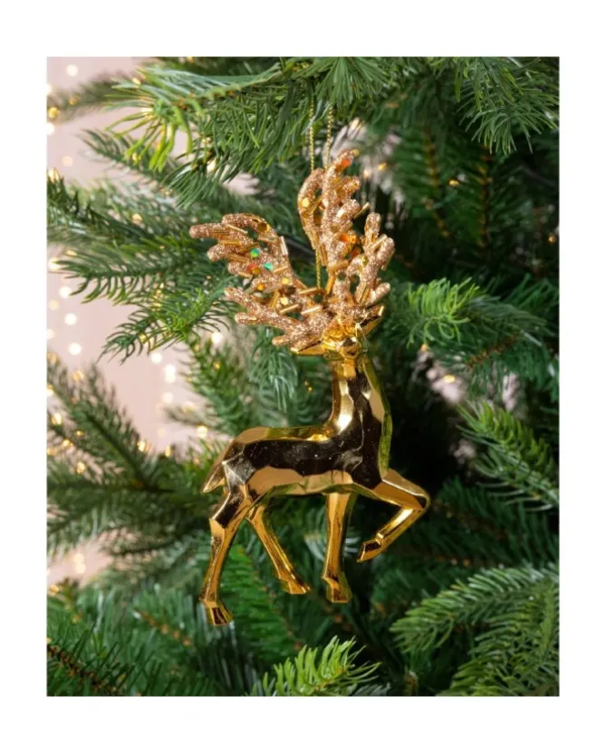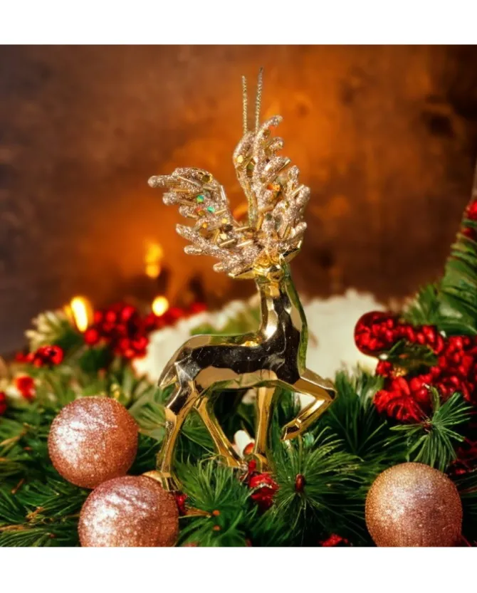 Misure: 2,5X7,5X16Cm1Pz Addobbo Pendente In Plastica Oro Cromato Renna Con Glitter 16 Cm