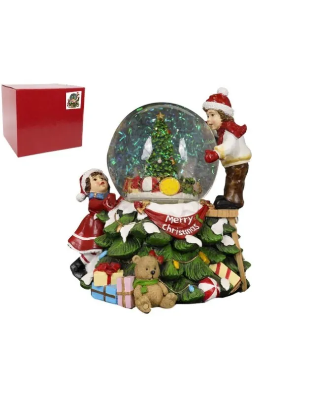 Misure: 20X20 Cmampolla Natalizia Realizzata In Resina Con Sfera Contenente Un Albero Di Natale In Movimento. La Decorazione Dell’Ampolla Si Arricchisce Di Statuine, Realizzate In Resina, Raffiguranti Bimbi.