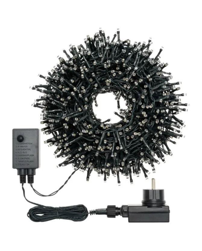 Lunghezza Luce:20,50 Mcatena Lineare Nastro Minicluster O6Cm Ntl 1000 Led Traditional O5Mm Reflex, Timer Memory Controller 8 Giochi Di Luce Selezionabili Con Timer On-Off 8-16 Ore Disinseribile Tramite Pulsante Luminoso, Trasformatore Bassa Tensione, Uso Esterno, Cavo Verde, Dimensioni 4+20,5M , Per Alberi H210-240Cm