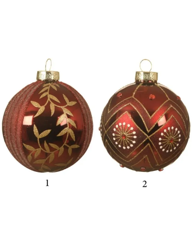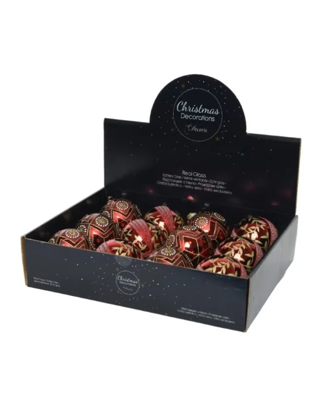 Pallina Rossa In Vetro E Velluto Con Glitter Oro Con Rombi Dia 8 Cm Cf 12Pz